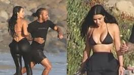 Kim Kardashian and Lewis Hamilton packed on the PDA during a beach date in Malibu, Calif. Clad in a black bikini and matching wetsuit, ...